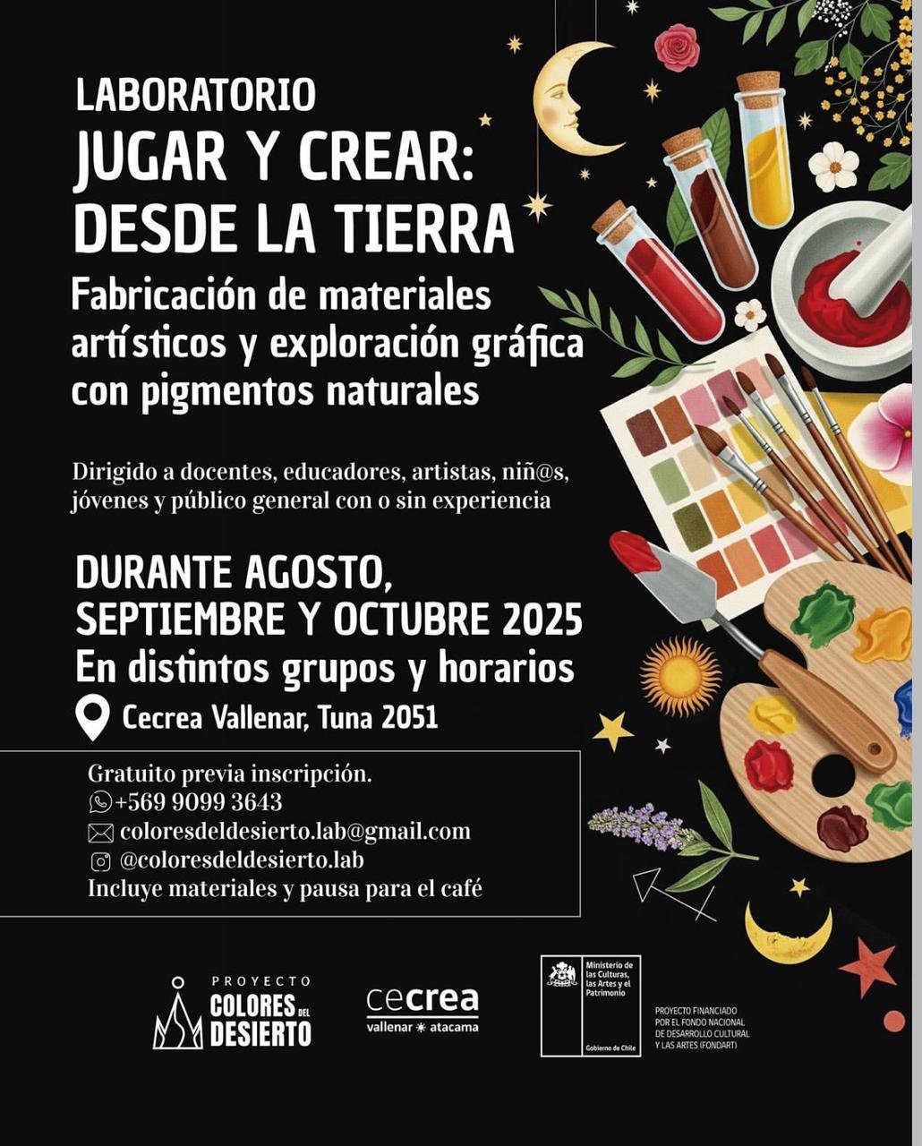 El proyecto “Colores del Desierto” invita a toda la comunidad de Vallenar y alrededores a participar en el laboratorio artístico “Jugar y Crear desde la Tierra”, una experiencia gratuita de formación y creación artística que enseñará a fabricar pinturas y explorar técnicas gráficas usando pigmentos botánicos y minerales recolectados en el territorio.