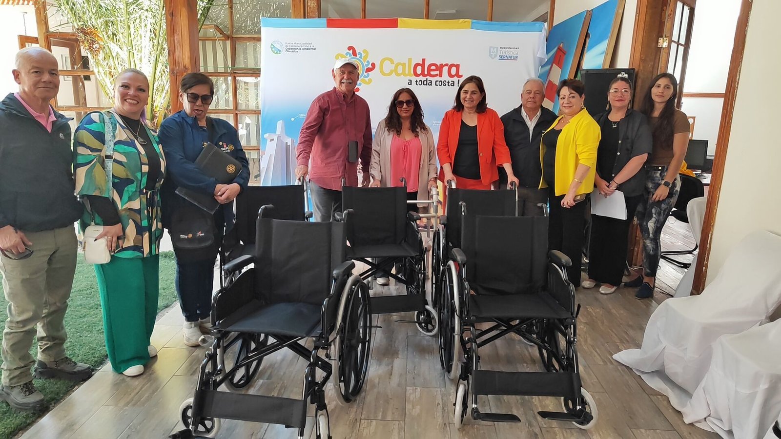 La entrega estuvo encabezada por Steven Colon Santos representante de Fundación FEDES, la alcaldesa de Caldera Brunilda González, la directora de Oficina UNIDIS Karen López, la directora de Dideco Verónica Peña, el representante Rotary Club Copiapó Jaime Marín y del Rotary Club Bahía – Caldera George Rodhis y los beneficiarios de las sillas y andadores.