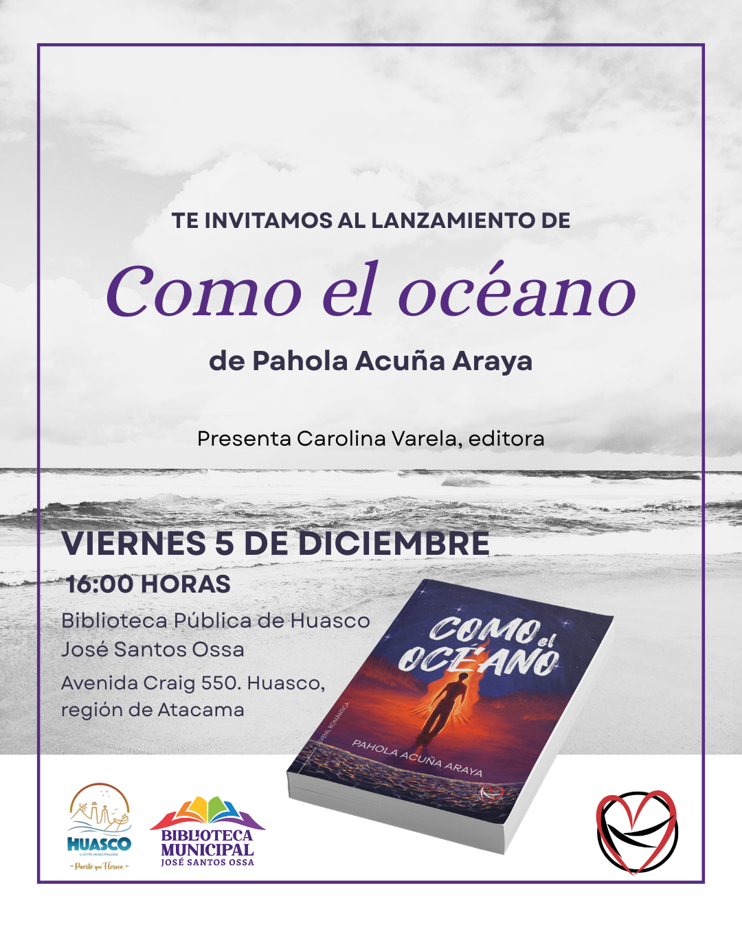 La presentación de “Como el océano” se llevará a cabo el viernes05 de diciembre de 2025, a las 16:00 hrs, en la Biblioteca Pública de Huasco José Santos Ossa, en Avenida Craig 550, Huasco.