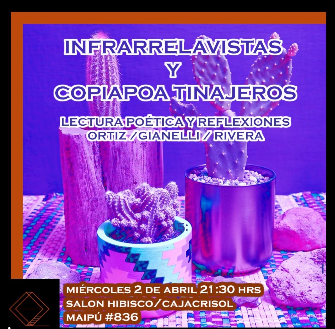 Este miércoles 02 de abril se realizará en la Caja Crisol la lectura “Infrarrelavistas y Copiapoa Tinajeros”, donde se encontrarán los escritores Vicente Rivera Plaza (Relave, El Ojo del Lagarto) y David Ortiz Zepeda (Salivario, Dirigibles) de Atacama, junto al autor mexicano Oswaldo Gianelli (Demoliciones).