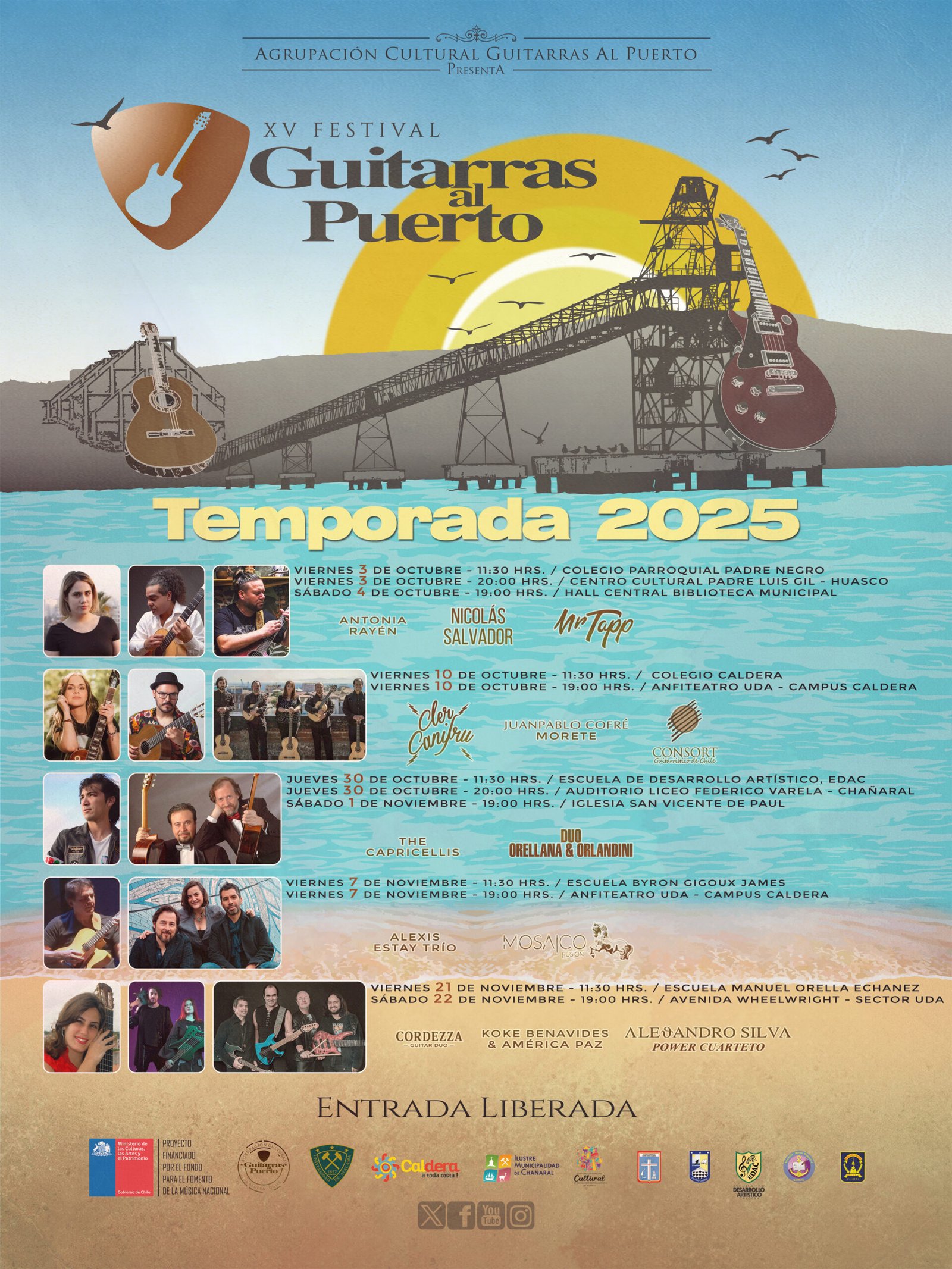 “Guitarras al Puerto” es un tradicional festival dedicado a este instrumento en todos sus géneros y este año en su décimo quinta versión se realizará entre octubre y fines de noviembre de 2025. Como es costumbre, el festival brindará una interesante y variada gama de estilos y exponentes en la guitarra, donde no faltarán las propuestas para guitarra eléctrica y acústica, ni tampoco los talentos locales y mujeres en el instrumento. De esta manera esta temporada 2025, sumado a Caldera se visitarán las comunas costeras de Huasco y Chañaral.