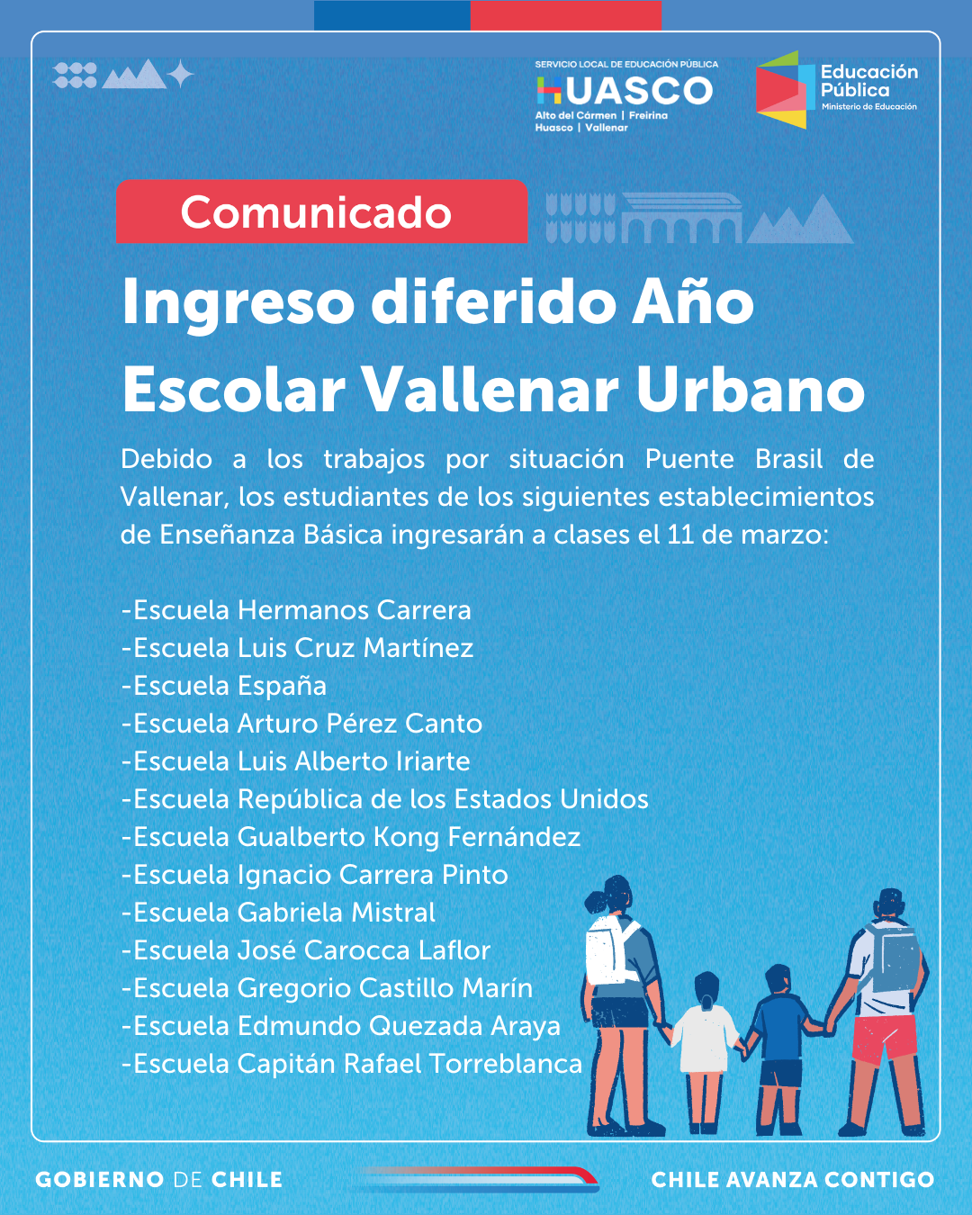 Debido a los trabajos que se realizarán en Puente Brasil de Vallenar, por parte del Ministerio de Obras Públicas –MOP-, los establecimientos educacionales dependientes del Servicio Local de Educación Pública –SLEP- Huasco, ubicados en el radio urbano de Vallenar, comenzarán sus clases el 11 de marzo.