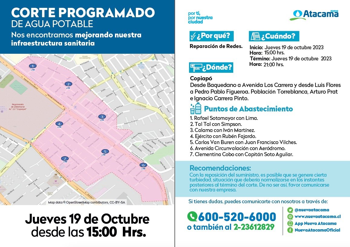 Con el objetivo de seguir perfeccionando y renovando infraestructura sanitaria, la cual ha permitido el mejoramiento en la continuidad y calidad de servicio, en Copiapó, se desarrollará un corte programado de agua potable para este jueves 19 de octubre, de 15:00 a 21:00 horas, en el perímetro comprendido de las calles; Los Carrera, Luis Flores, Avenida Circunvalación, Guacolda hasta pasaje Irene Frei e incluyendo Carlos Van Buren.