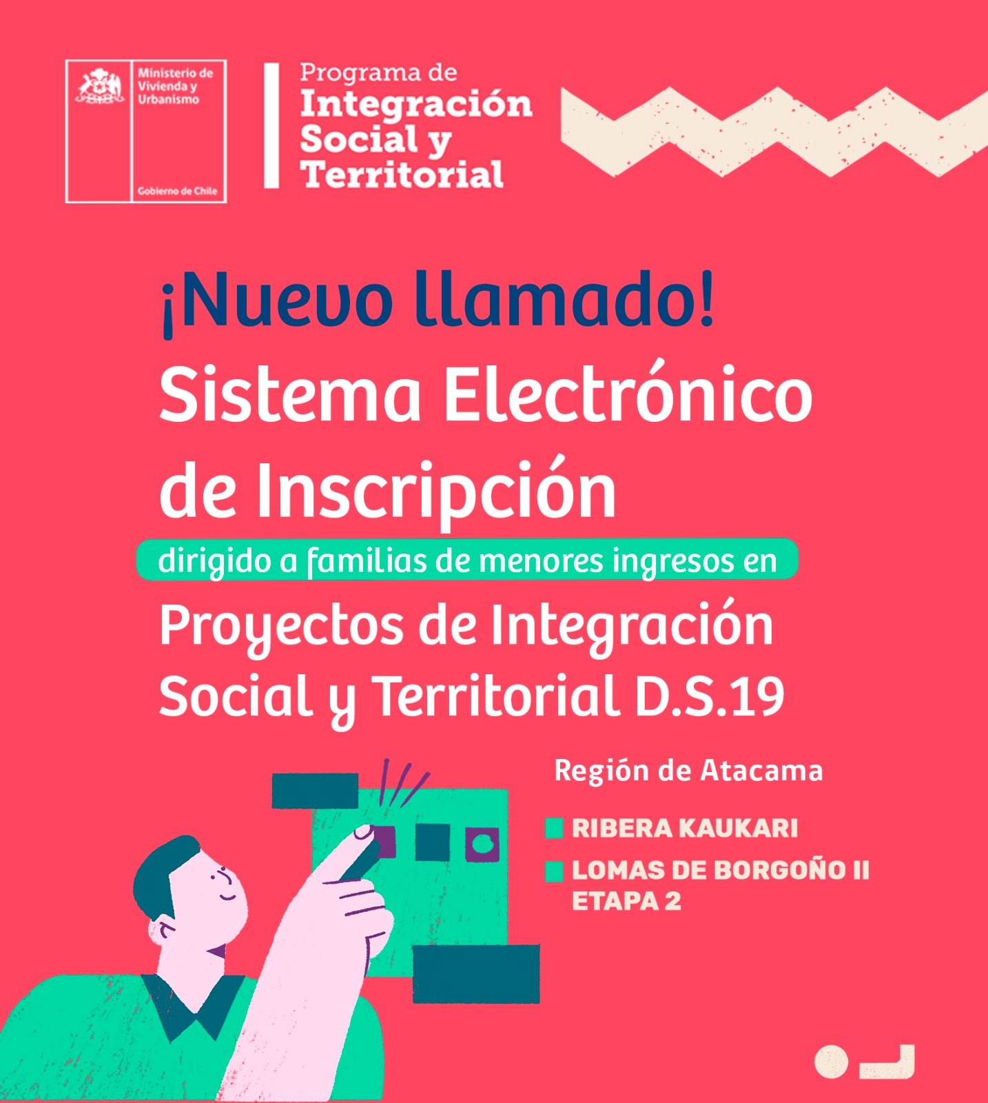 El Ministerio de Vivienda y Urbanismo en la región de Atacama, a través del Programa de Integración Social y Territorial, informa la apertura de un nuevo Sistema Electrónico de Inscripciónque permite la postulación a proyectos habitacionales bajo el Decreto Supremo N°19 en la comuna de Copiapó, especialmente dirigido a familias de menores ingresos que cuenten con subsidio habitacional DS49 vigente.