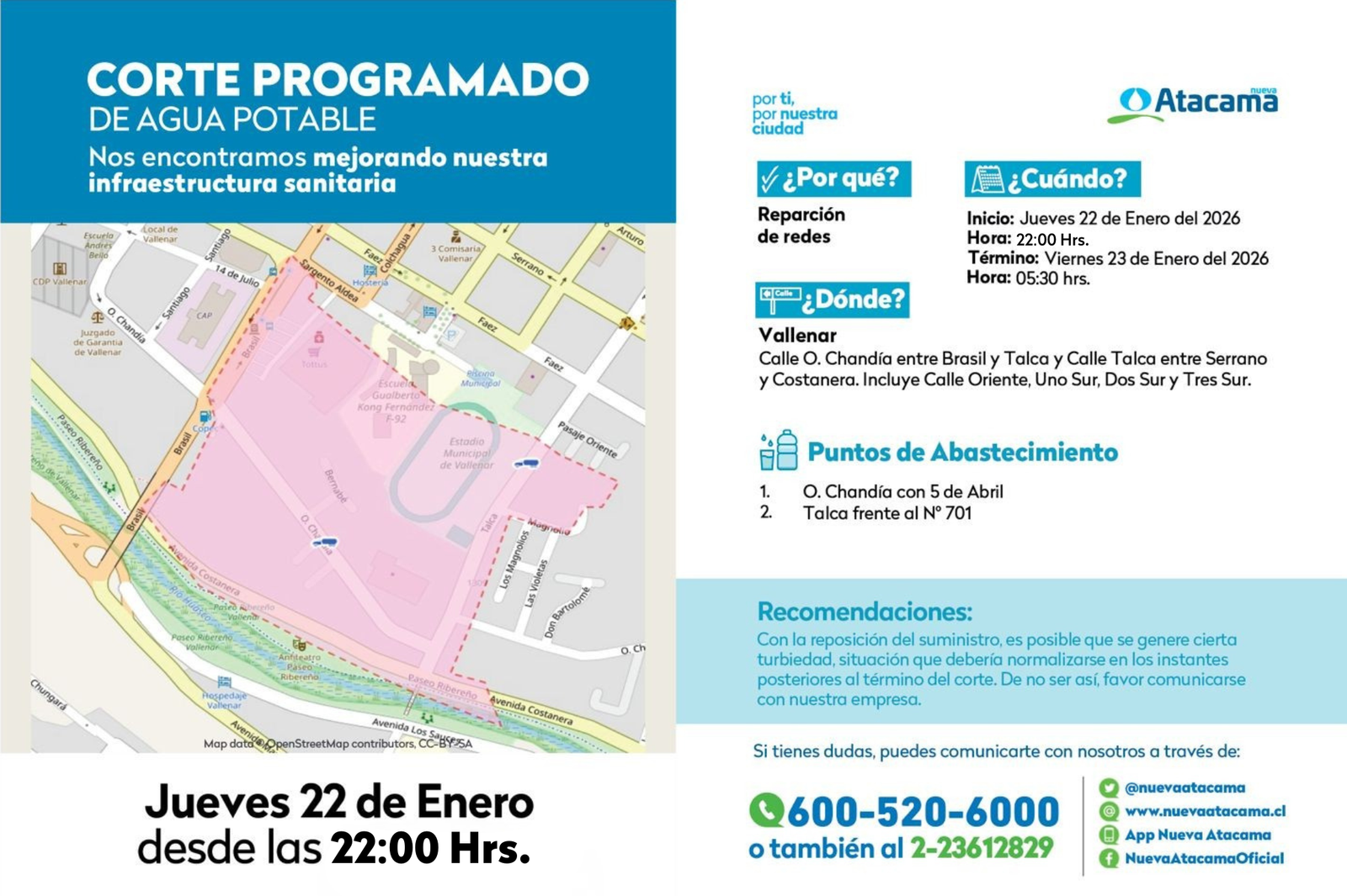 Para conocer más antecedentes e informarse sobre los puntos fijos de agua potable disponibles para la comunidad, los usuarios pueden visitar el sitio web www.nuevaatacama.cl, en el apartado “Datos útiles”, donde podrán revisar el mapa de su comuna con el detalle correspondiente. Asimismo, pueden comunicarse al 600 520 6000 o consultar las redes sociales oficiales de la empresa.