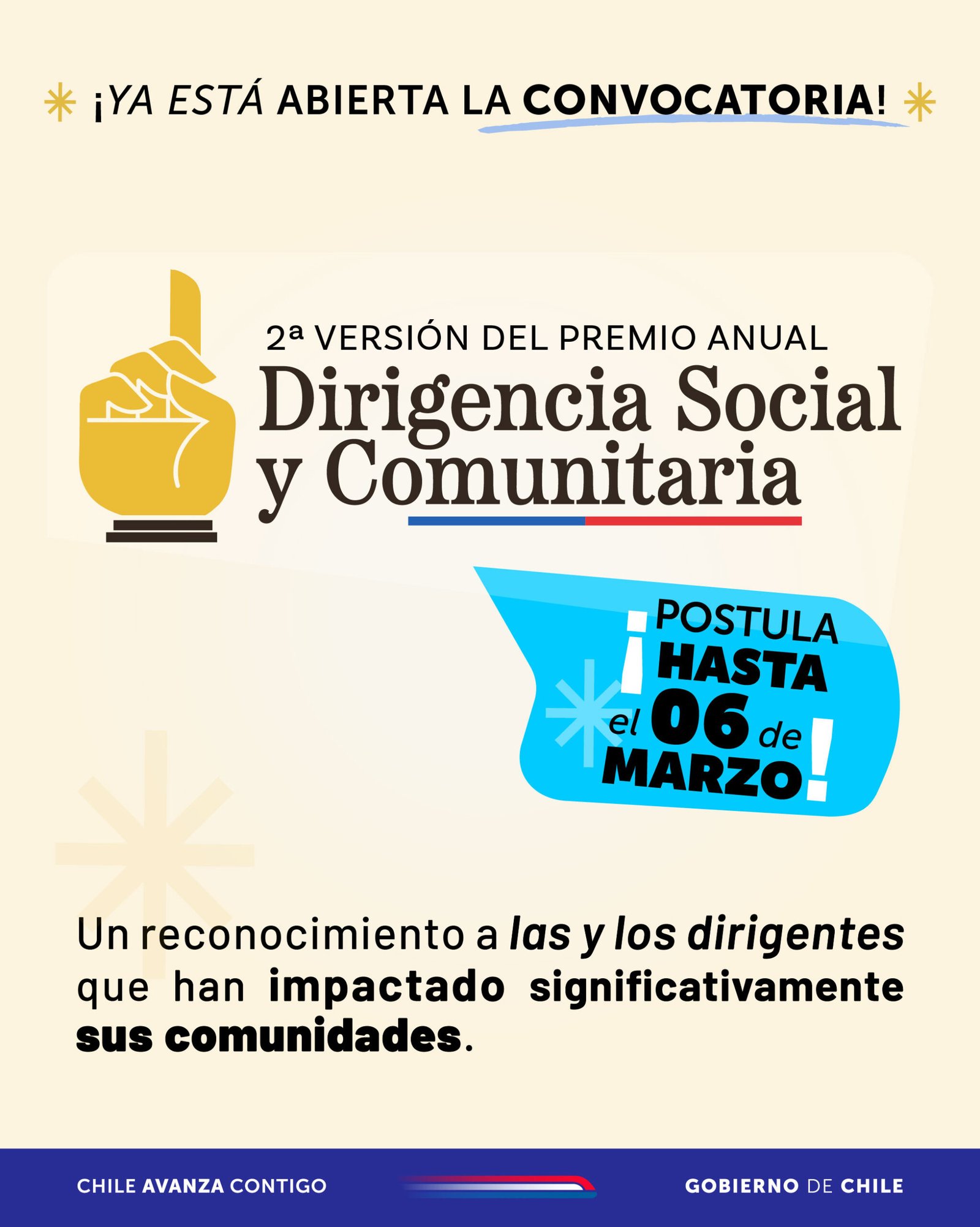 El Ministerio Secretaría General de Gobierno, a través de la División de Organizaciones Sociales, publicó las bases para postular a la Segunda edición del Premio Anual Dirigencia Social y Comunitaria 2026, iniciativa que busca reconocer a los dirigentes y dirigentas sociales que han impactado positivamente en sus comunidades y territorios.