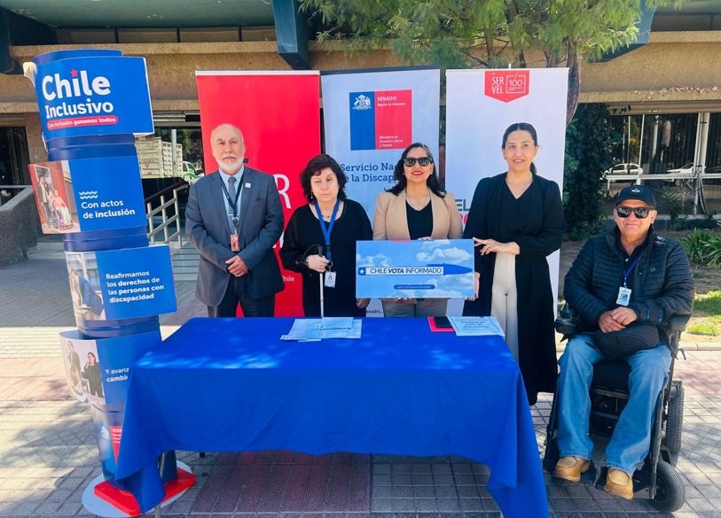 Con el objetivo de reforzar las medidas dispuestas y promover la participación de las personas con discapacidad y problemas de movilidad, en el marco de las elecciones presidenciales y parlamentarias 2025, la Seremi de Desarrollo Social y Familia, Verónica Rivera Reynoso; la directora regional del SENADIS, Gabriela Villanueva Fuentealba y el Jefe de Operaciones Electorales (Servel Atacama), Luis Gueren Olivares, junto a; Ilia Gallardo, presidenta de la Agrupación de Familiares y Amigos de Ciegos de Copiapó y secretaria de la Unión Comunal de Discapacidad de Copiapó, y el presidente de la Unión Comunal de Discapacidad de Copiapó, Miguel Martínez Espinoza, desarrollaron un punto de prensa en el frontis de la Delegación Presidencial.