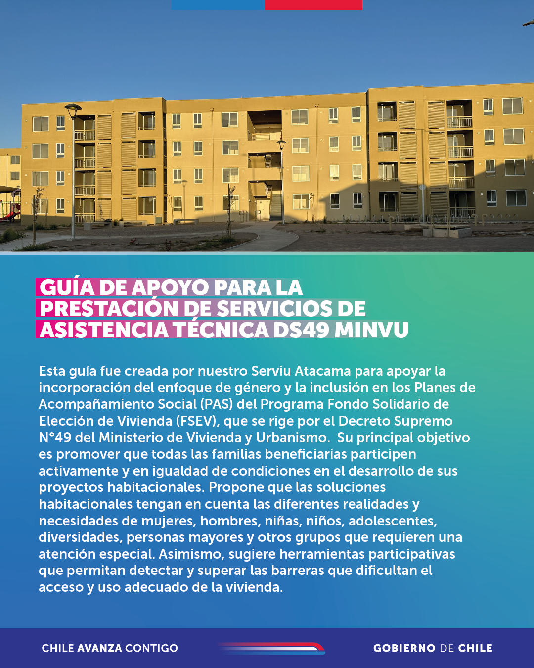 La Guía de Apoyo y Orientaciones Técnicas para el abordaje de cuestiones de Género y otros aspectos de Inclusión está disponible para descargar en el sitio web www.serviuatacama.cl, banner de Igualdad de Género; y, también, como láminas informativas en las redes sociales del @serviuatacama para conocimiento de toda la comunidad.