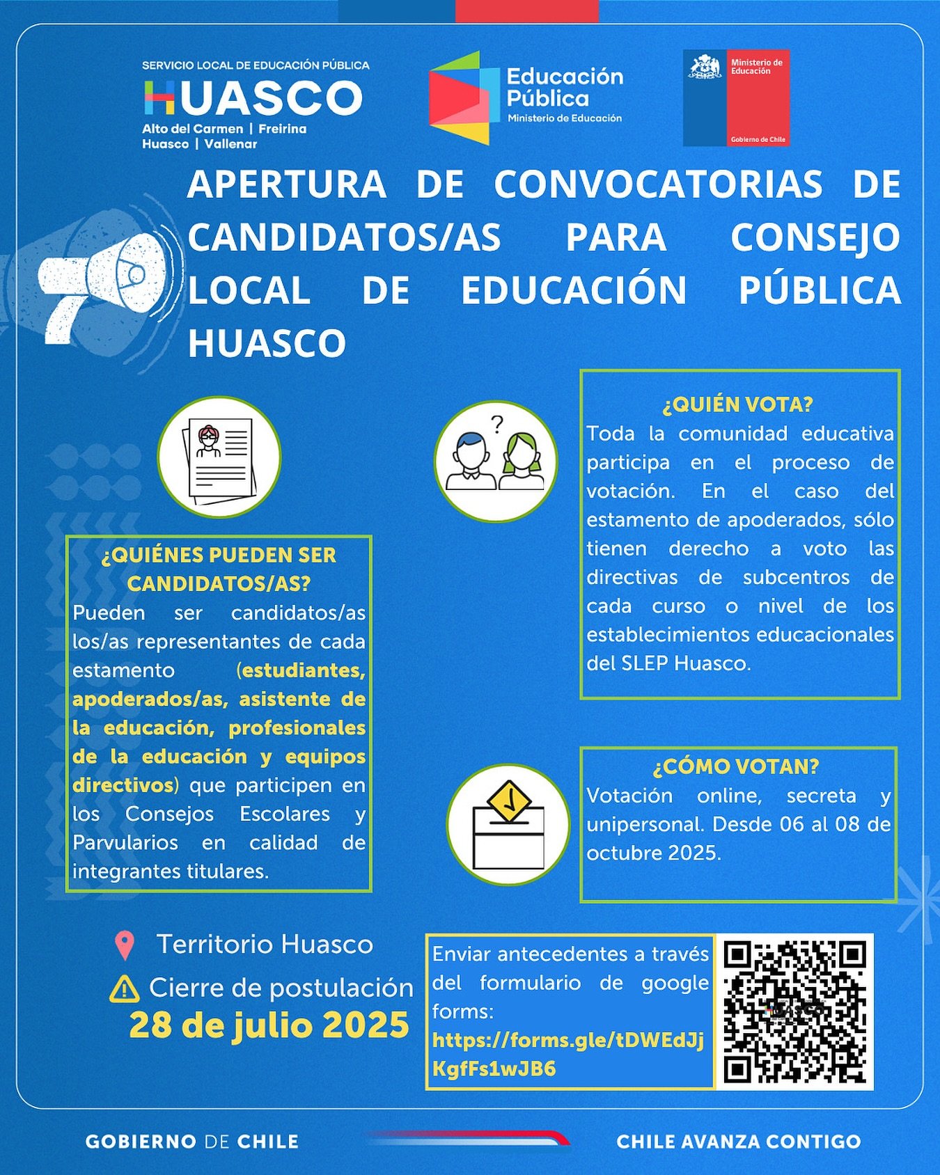 El territorio del Servicio Local de Educación Pública –SLEP- Huasco, está viviendo un nuevo proceso eleccionario del Consejo Local 2025, gobernanza establecida en la Ley 21.040 que rige al Sistema de Educación Pública y que permite tener representación de equipos directivos, docentes, asistentes de la educación, profesionales de la educación, estudiantes, madres, padres y apoderados de escuelas, jardines y liceos, en esta instancia participativa que representa las particularidades e inquietudes de los establecimientos educacionales ante la dirección ejecutiva del Servicio Local.